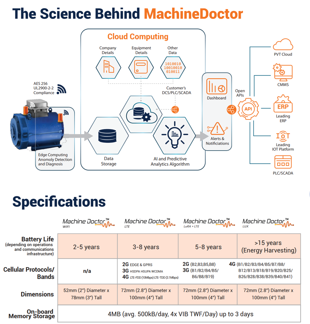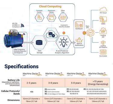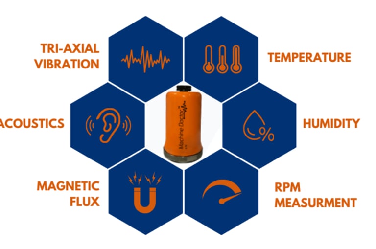The sensor can detect and measure Triaxial Vibration, Acoustic Emissions, Temperature, True RPM, Humidity, and Magnetic Flux. Installed & connected in less than 5 minutes, the Machine Doctor sensor can be easily configured and deployed on your ow